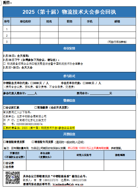 附件:2025(第十屆)物流技術(shù)大會(huì)參會(huì)回執(zhí)+單位名稱(chēng)+酒店信息.docx