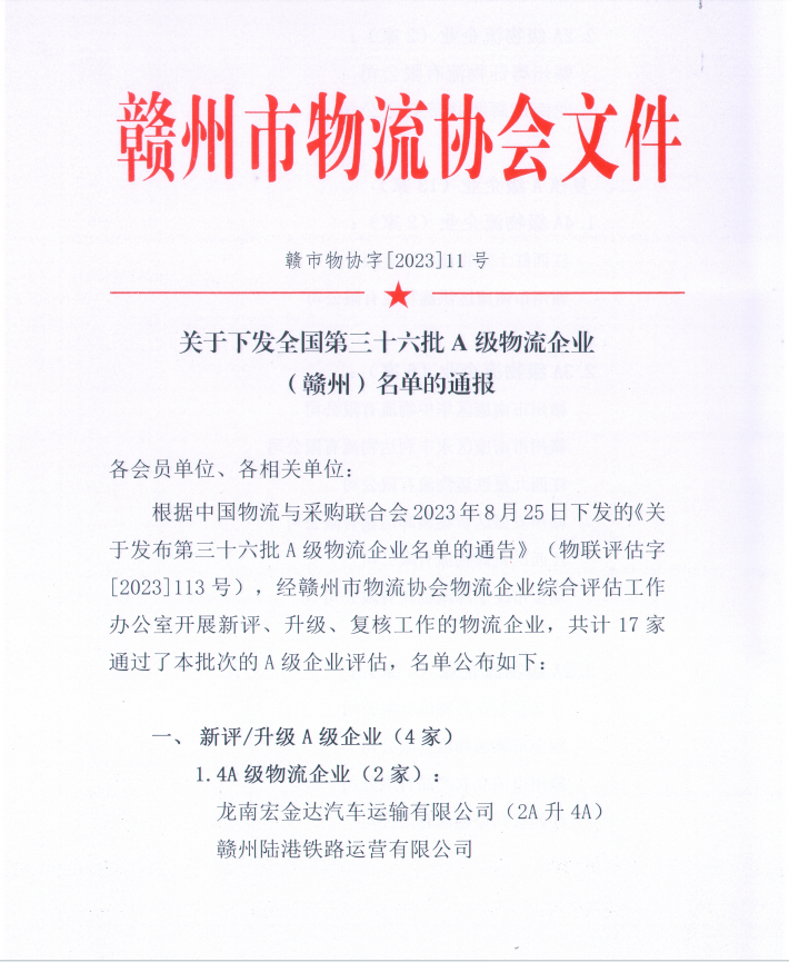 關(guān)于下發(fā)全國第三十六批A級物流企業(yè)(贛州)名單的通報