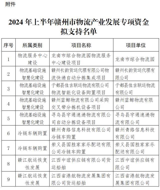 附件:2024年上半年贛州市物流產(chǎn)業(yè)發(fā)展專項資金擬支持名單