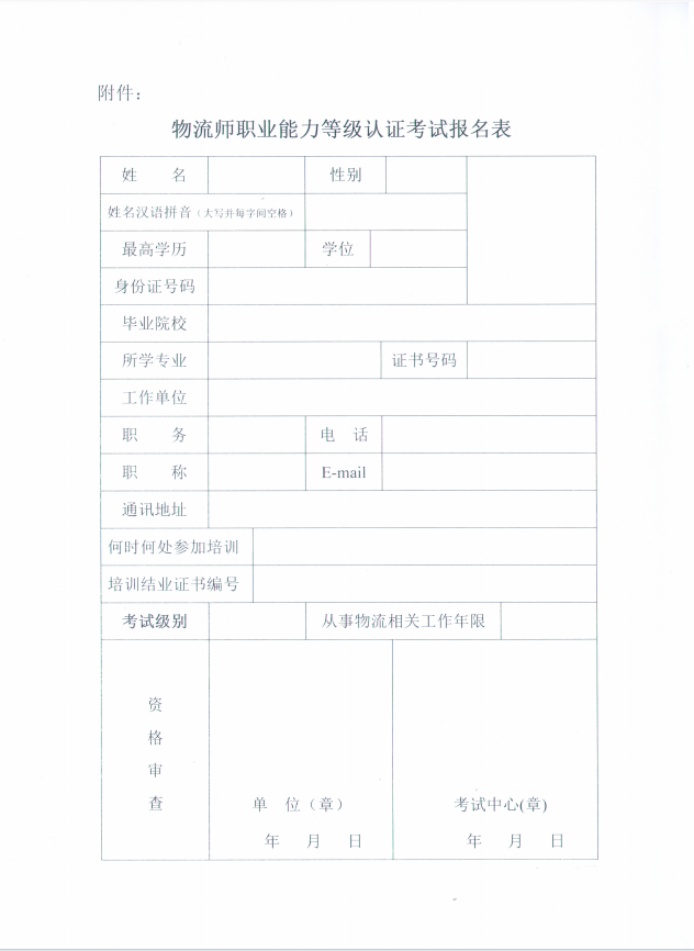 附件:《物流師職業(yè)能力等級(jí)認(rèn)證考試報(bào)名表》