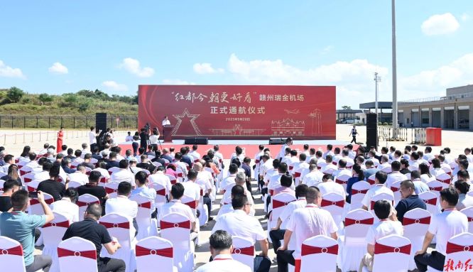 市委書記黃喜忠宣布贛州瑞金機(jī)場(chǎng)正式通航。中國(guó)民用航空華東地區(qū)管理局副局長(zhǎng)顧青頒發(fā)機(jī)場(chǎng)使用許可證。江西省機(jī)場(chǎng)集團(tuán)總經(jīng)理姜春陽(yáng)致辭。市人大常委會(huì)主任趙多仙,市政協(xié)主席徐兵,市領(lǐng)導(dǎo)尹忠等出席通航活動(dòng)。市領(lǐng)導(dǎo)鄒治宇主持。