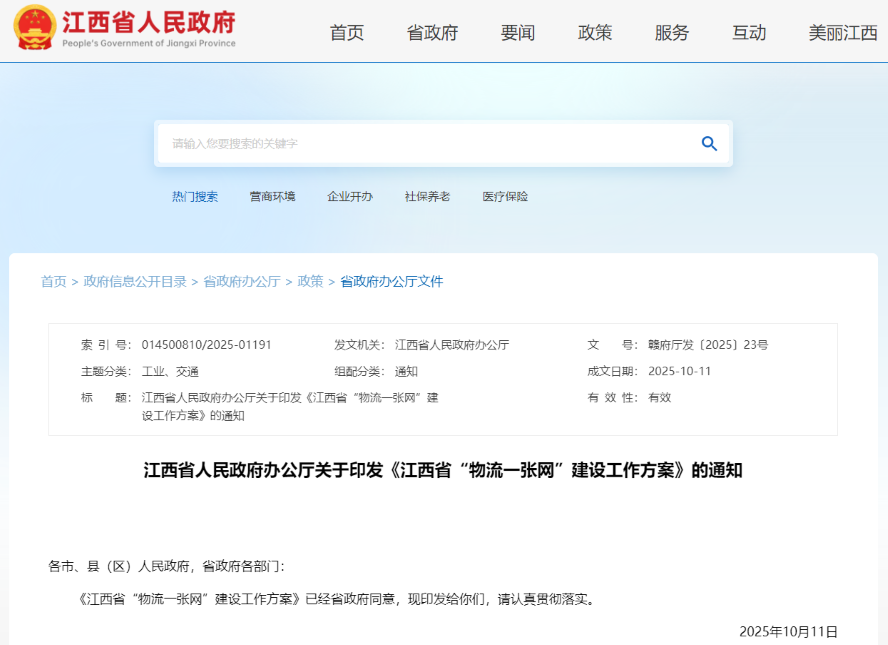 最新通知!江西發(fā)布“物流一張網(wǎng)”建設(shè)工作方案