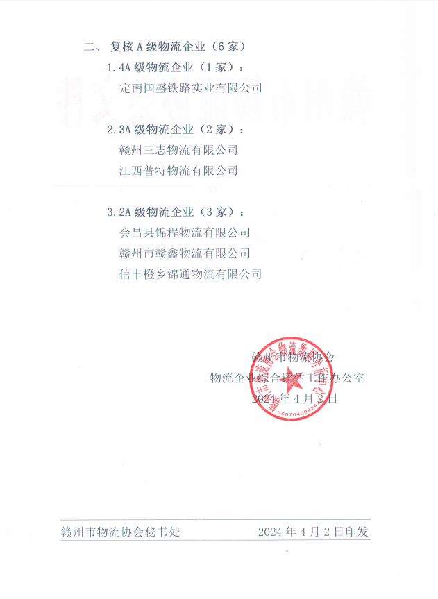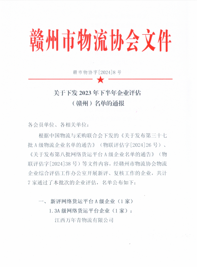 根據(jù)中國(guó)物流與采購(gòu)聯(lián)合會(huì)下發(fā)的《關(guān)于發(fā)布第三十七批A級(jí)物流企業(yè)名單的通告》(物聯(lián)評(píng)估字[2024]26號(hào))、《關(guān)于發(fā)布第八批網(wǎng)絡(luò)貨運(yùn)平臺(tái)A級(jí)企業(yè)名單的通告》(物聯(lián)評(píng)估字[2024]38號(hào))等文件內(nèi)容,經(jīng)贛州市物流協(xié)會(huì)物流企業(yè)綜合評(píng)估工作辦公室開(kāi)展新評(píng)、復(fù)核工作的企業(yè),共計(jì)7家通過(guò)了本批次的企業(yè)評(píng)估,名單公布如下: